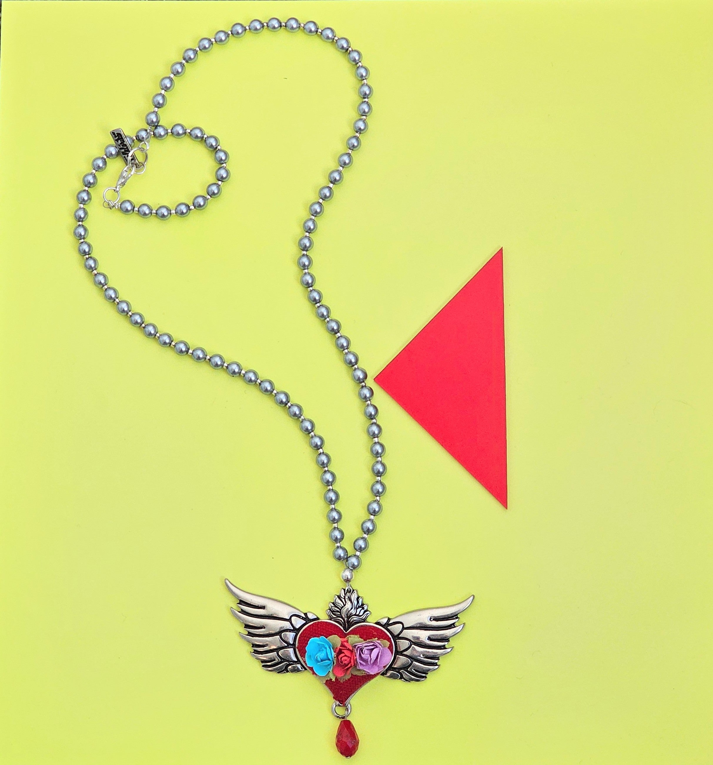 Introducing our exquisite Alas De Amor, a true embodiment of elegant artistry. This stunning piece features delicate silver beads meticulously crafted into a captivating design. At the center of attention is a heart-accented charm with graceful wings, symbolizing the boundless power of love and freedom. Surrounding the charm are soft fabric roses in a gentle hue, exuding a touch of romance and femininity. The roses are further enhanced by a vibrant red bead, adding a pop of color and allure.
